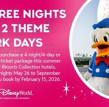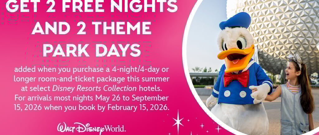Este verano, Disney lanza una promoción imperdible: obtén 2 noches gratis de hotel y 2 días adicionales de parques temáticos al reservar un paquete seleccionado de hotel + entradas.